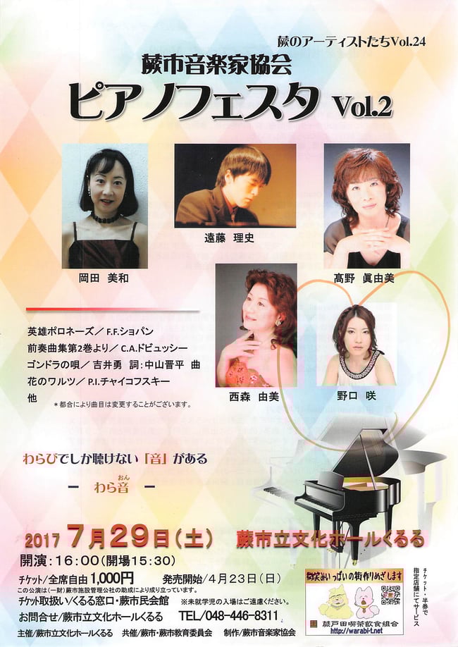 あまの音楽教室の野口咲先生が、先日演奏会に出演しました。 会場は、野口先生の地元の蕨市文化ホールくるるで、 行いました。 曲はラフマニノフの6手連弾でした。1つのピアノを3人で弾きます。 すごい迫力でしたでしょうね。聴きたかったです!! 私もチケットを購入しようとしたら、すでにチケットは完売されていました。 大盛況だったみたいです。